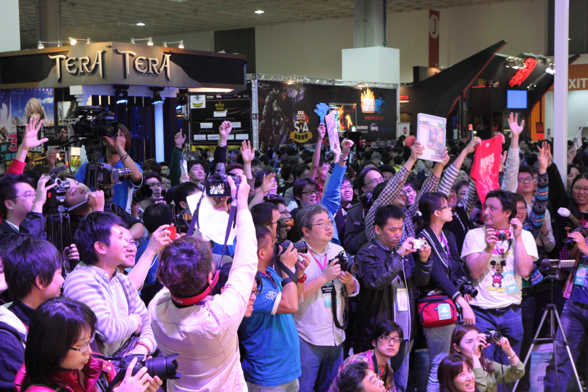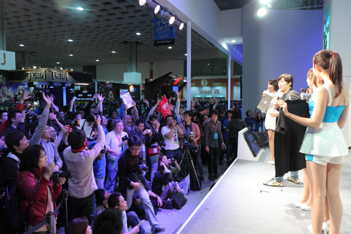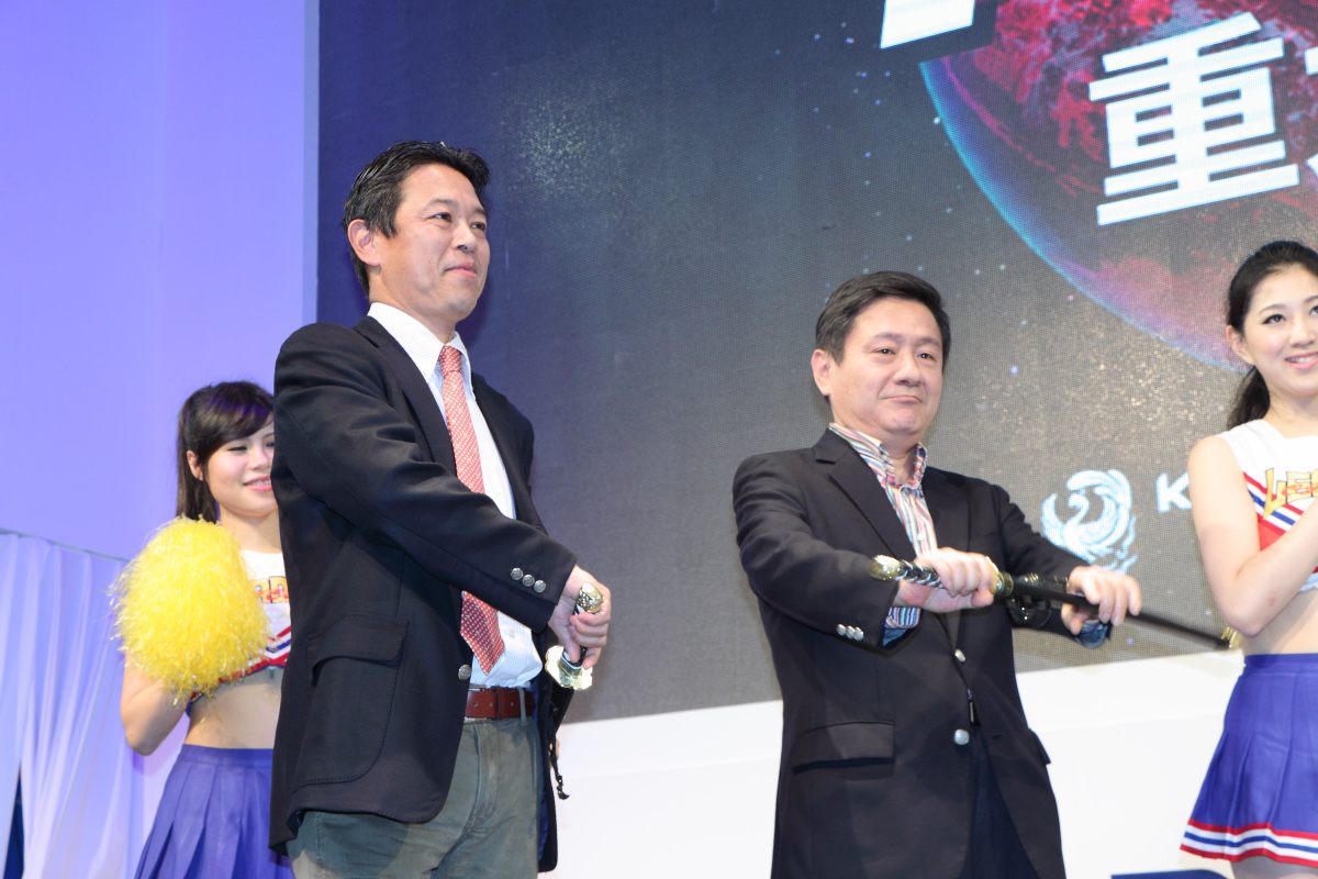 在介紹完遊戲特色之後,舞台上又請出安田善巳以及 SCE Asia 總裁織田博之,3 人手持武士短刀一同劈開遊戲招牌,秀出裡面的「中文化決定」的訊息。雖說相關消息在展前記者會的時候就公布過了,不過由須田剛一陪同角川遊戲與 SCE Asia 兩巨頭一同宣布,仍獲得玩家熱烈支持。