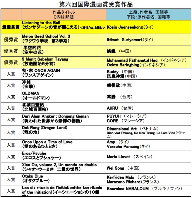 今年度的的大獎是由泰國的漫畫家 Kosin Jeenseekong 作品《Listening to the Bell》奪得,該作描述面對母親突然再婚的主角,只好去投靠在島上教導泰國傳統樂器的父親,但萬萬沒想到父親已經不在人世了。沒有歸所的主角,決定和父親再婚對象的年輕女性還有父親的弟子展開新生活,並也開始學習父親還在世時傳授的泰國傳統樂器。