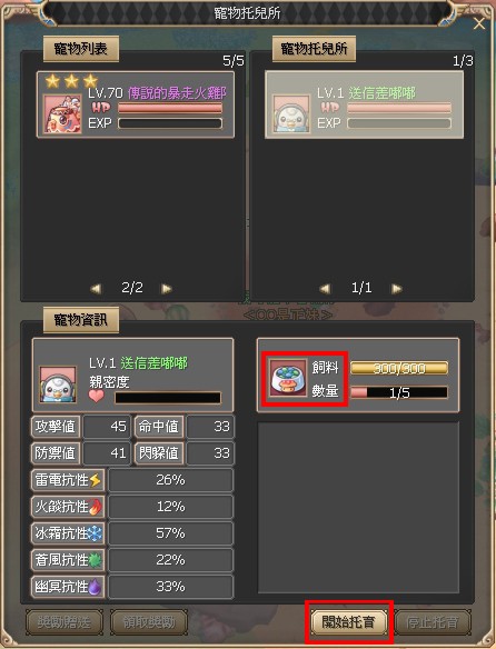 放上寵物飼料按下「開始托育」,就可以讓寵物獲得經驗囉!