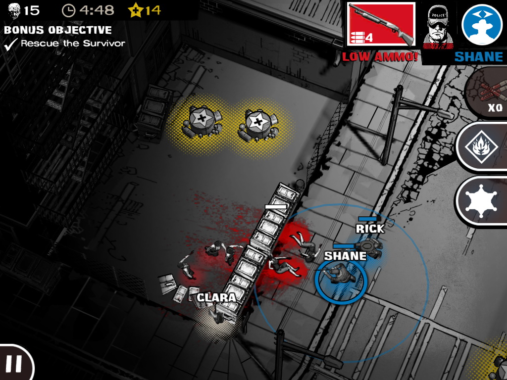 《陰屍路:屍群突襲》一改之前《Walking Dead:The Game》主打劇情向的作風,改採即時動作闖關類型進行遊戲,內容上也較偏近於原著,玩家將可使用瑞克(Rick)、夏恩(Shan)、葛倫(Glenn)等熟悉的人物在關卡中作戰。