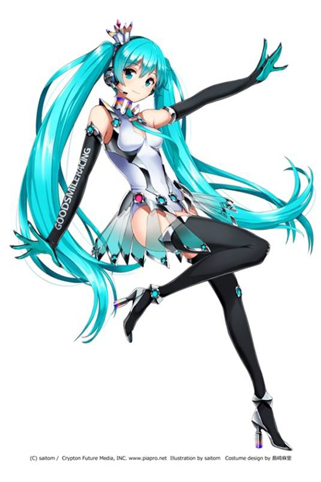 車隊官方形象角色 2013 年度「賽車初音 2013 ver.」,係由 SEGA & PlatinumGames 推出的 PS3 / Xbox 360 動作遊戲《魔兵驚天錄》人設 島崎麻里負責設計服裝,插畫家 saitom 繪製出以水色與白色為基調的全新「初音未來」插圖。