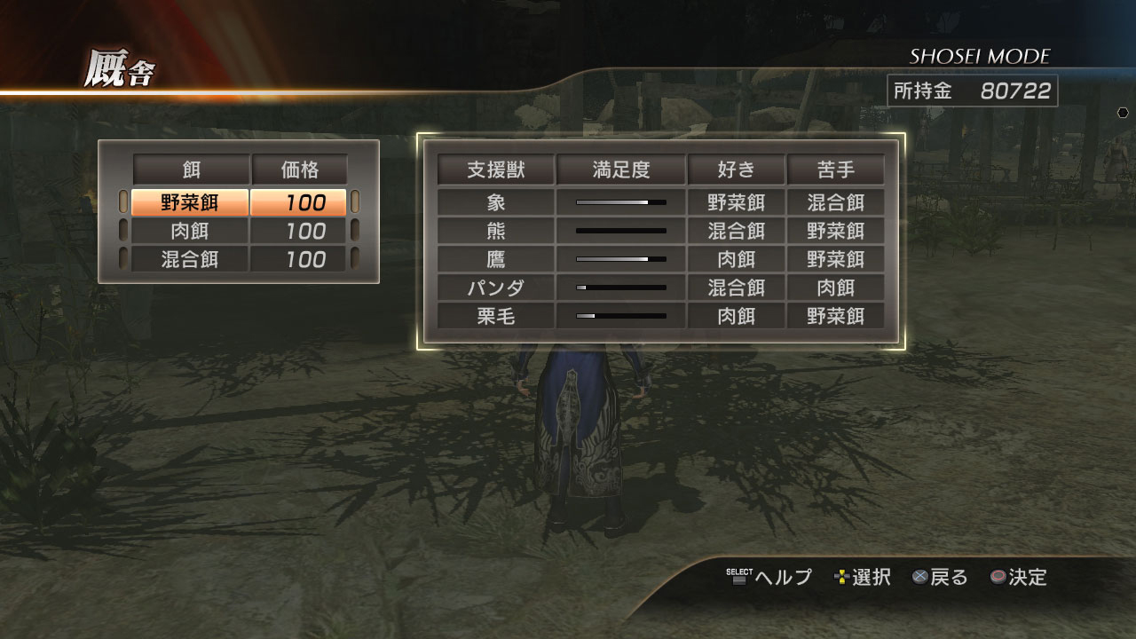 在戰場上獲得「獸寶玉」,或者在基地裡的設施「交易所」中購買,都可以獲得在戰場中跟玩家一起行動的「支援獸」。支援獸有著像熊貓這種在武將身邊一起戰鬥的 “支援型”,以及馬跟大象這些可騎乘移動來進行攻擊的 “騎乘型” 兩種。