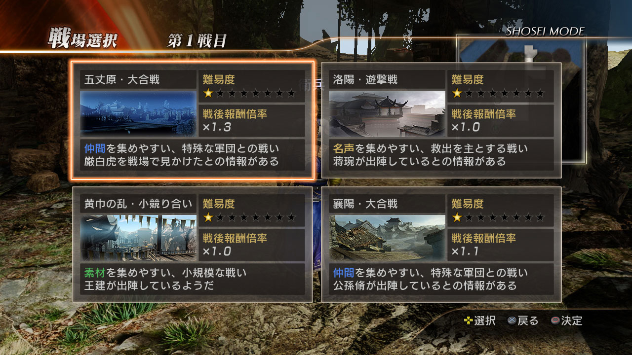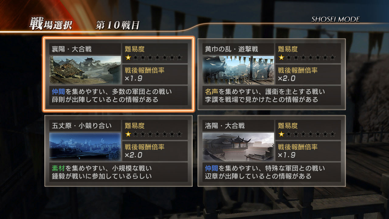 將星模式的戰鬥分為,容易收集到武將的「大合戰」,容易獲得名聲的「游擊戰」,適合收集適合的「小競爭」三種,玩家可自由選擇。雖然可以連續進行複數戰鬥讓使報酬倍率增加,但持續進行連戰的話難易度就會提升,在戰鬥中敗北的話,連戰中所獲得的金跟經驗值都會喪失。