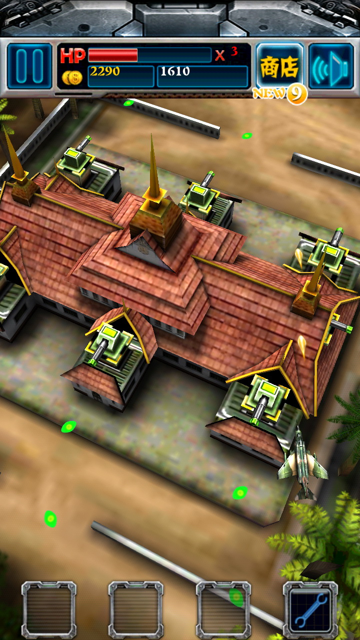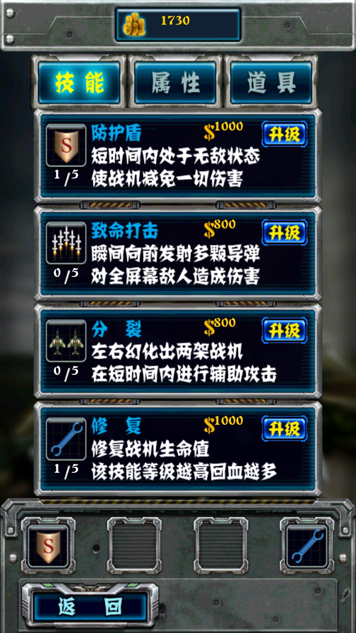 「致命打擊」則是全畫面攻擊,類似一般遊戲的大絕;使用「分裂」時,會出現兩台僚機,分別對不同方向進行射擊,當敵人出現在後方時可說是非常實用的技能;而在瀕死時則可使用「修復」回復自機的生命值。技能並沒有使用次數的限制,只要冷卻時間結束就可以再次使用,此外在擊破敵人的時候也有機率會掉出技能道具,只要碰觸到就會立刻發動技能。