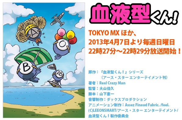 而其動畫作品已確定將自 4 月 7 日起每週日在日本播出長約 2 分鐘的短篇動畫,參演聲優包括了福山潤(A 型)、中村悠一(B 型)、石田彰(O 型)、柿原徹也(AB 型)。