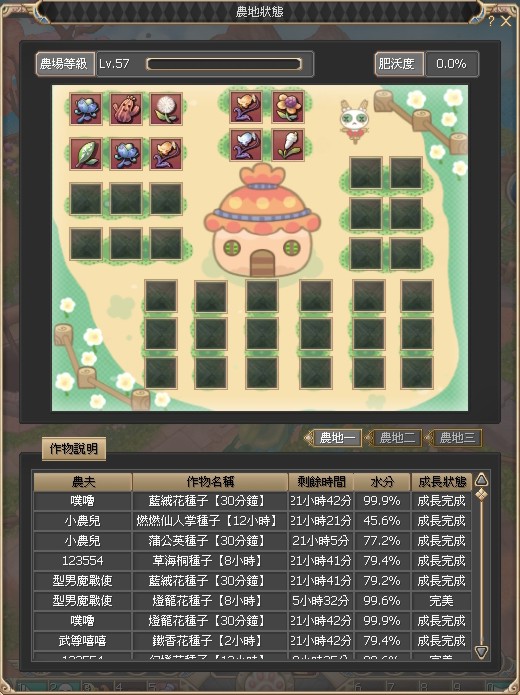 種植好之後,到農地上觀看自己的作物,幫自己的作物澆水保持充足水分,或在農地上施肥提高土壤的肥沃度。在玩家的細心照顧下,看著它漸漸成長茁壯,就有機會種植出品質優良的作物喔!