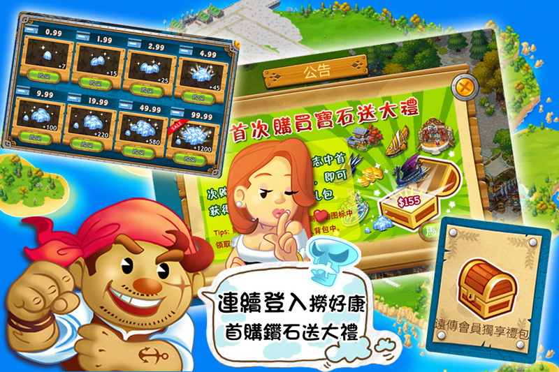 為了迎接船長們的加入,玩家除了連續每日登入,都可以獲得不同獎勵外,即日起遊戲內更有「首購寶石送大禮」、「在線禮包拿不完」、「評論大爆衝」等一連串活動。其中,玩家在遊戲內達到一定的時間可獲得高額的遊戲金幣、鑽石以及船隻建築等眾多獎勵;另外,玩家購買任意額度的寶石,也即可獲得高額的首儲禮包。