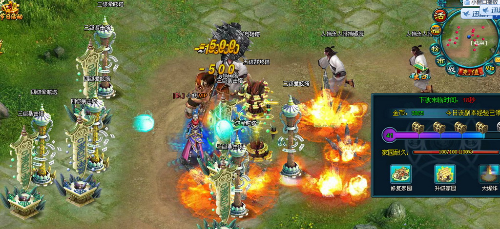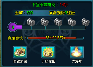 玩家在遊戲中時時刻刻深處險境,除了鬥勇還要鬥智!在「塔防副本 - 守衛家園」裡,人物自身無法直接擊殺怪物,需透過防禦建築來消滅,擊殺怪物可獲得金幣獎勵,當建築等級越高,消滅的威力則越強大,每次建造或升級防禦建築均需消耗金幣,系統每隔一段時間將自動提供,同時進行「升級家園」提升等級,系統提供的金幣則越多。