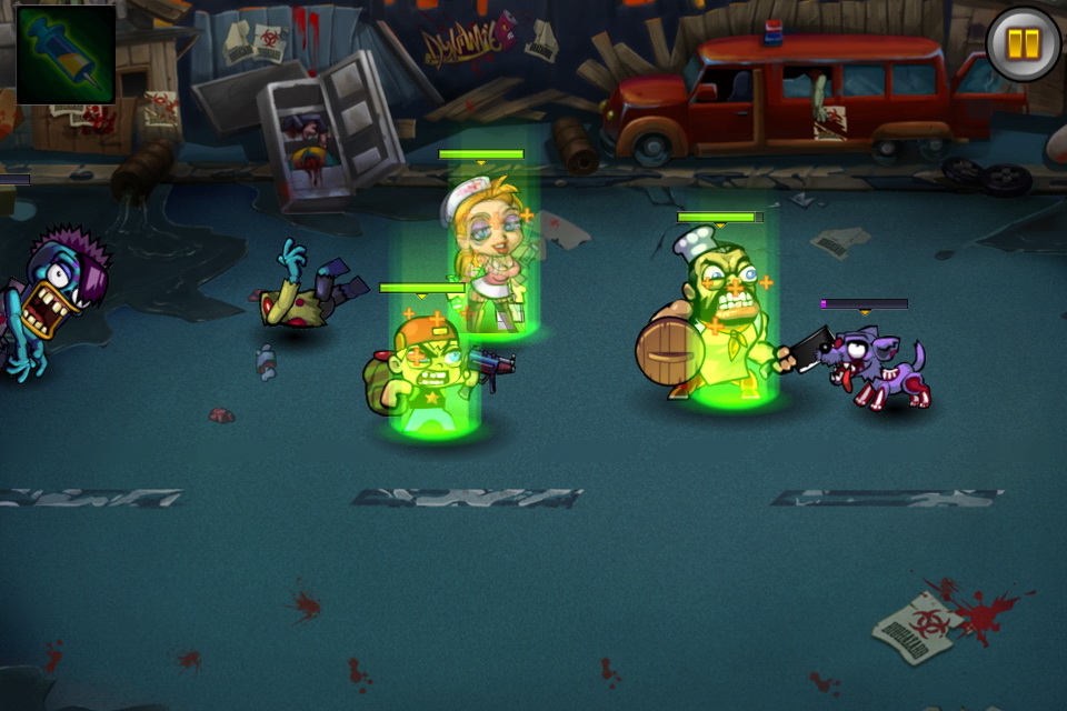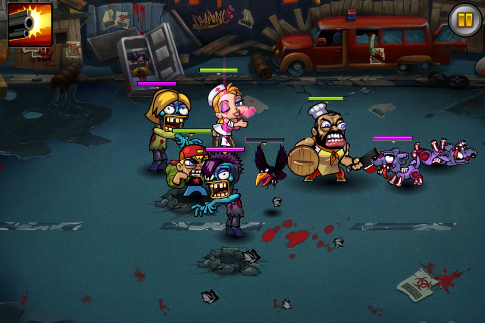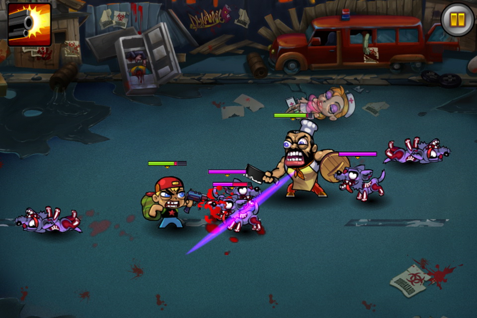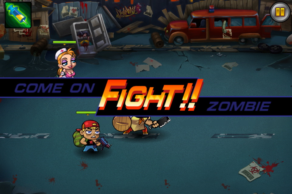 遊戲中玩家可以觸控螢幕控制角色移動,再以劃線方式引導角色去進行攻擊。遊戲場景當然為一片頹垣敗瓦的城市場景,外表粗獷內心溫柔的老爸與護士姐姐果斷發起抵抗殭屍,拿起各種日常用品 - 菜刀與針筒就去跟殭屍拼命去了!