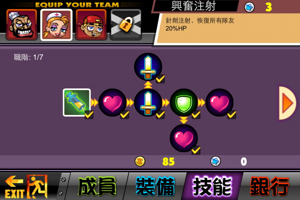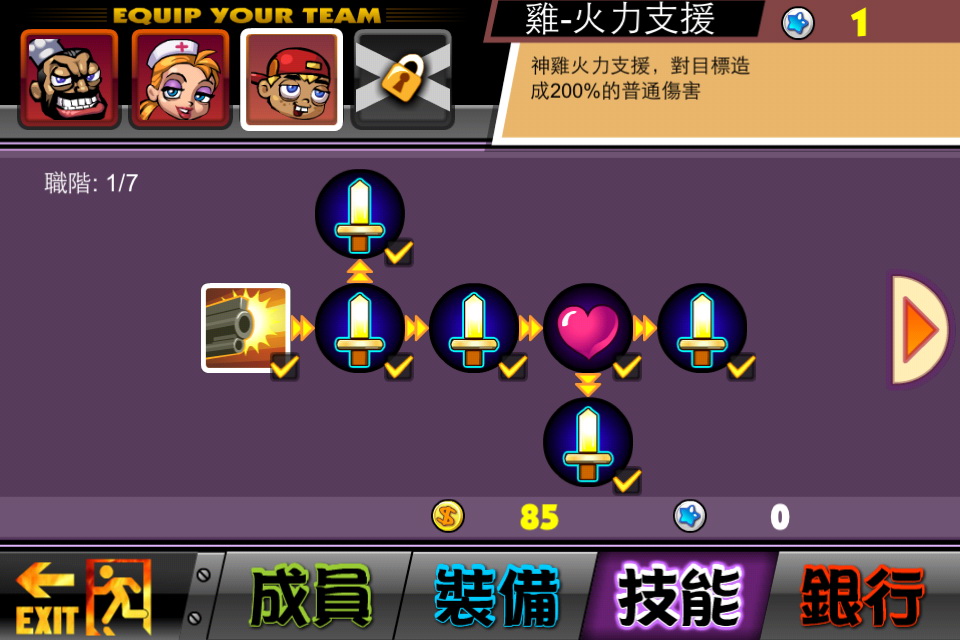遊戲內有豐富的技能樹,每通過一次關卡都能獲得技能點和隨機的道具,可以用作強化角色。根據官方提供的資料,遊戲內有過百種主動和被動技能,超過 60 種神兵利器,好好搭配會是通關的關鍵。