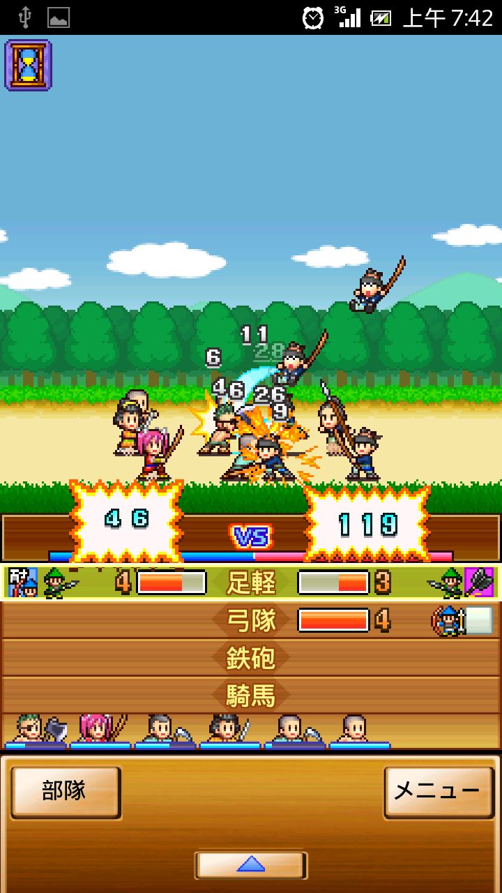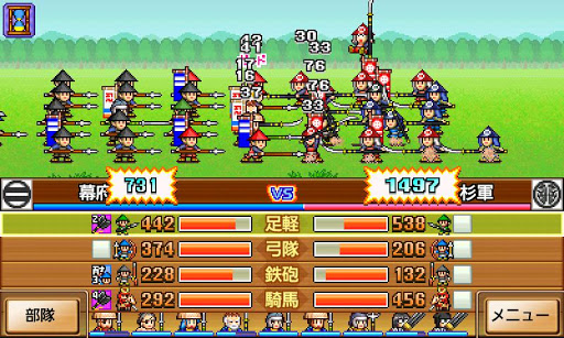 開始進攻對戰時,兩邊的兵力會分成前中後三排互相對峙,在搭配上「足輕(步兵)」、「弓兵」、「騎兵」和「鐵炮隊」等不同兵種的相剋作用,相當考驗玩家戰術能力。