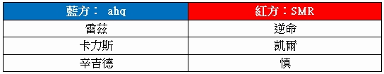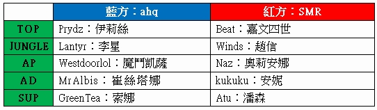 面對強敵ahq,SMR決定來個不一樣的組合,Naz(陳添志)在這場比賽使用奧莉安娜走中路,而jungle的位置是Winds(陳鵬年)以趙信替代,安妮和潘森負責下路。不過SMR奇招失敗,被ahq擊敗。ahq來到第二戰,儘管在選角以及開場被CHT連續拐騙,卻還是在會戰中扳回經濟,最後以全勝收場!