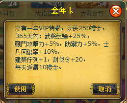 除了新增的各類商店,《夢想三國》"一騎當先"裡所有玩家都拍手稱快的改變就要數 VIP 卡增加士兵回复率的加成,這個加成的存在使得很多以前回复率在 90 % 左右徘徊的玩家有了輕鬆滿回复的可能,令玩家出征更加隨心所欲,不必有死兵的困擾。