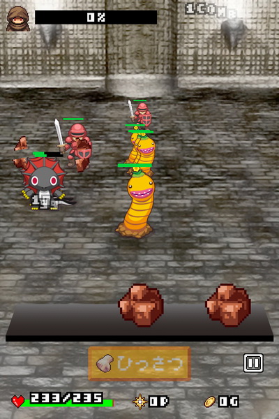 在關卡中的戰鬥規則很簡單。只要以滑動操作來選擇畫面下方的「小石子」來砸面臨而來的魔物即可。魔物們會顯示 HP 計量表,每次被石頭打到都會減少。當魔物的 HP 規 0 時就等於擊破牠了,玩家可獲得經驗值。