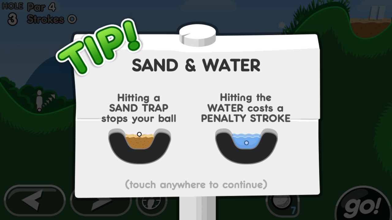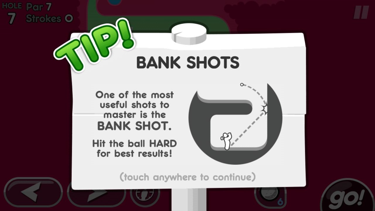 本作本來就是以奇怪的關卡聞名,所以碰到遊戲中的特異場地設計,玩家也不要太拘泥於普通高爾夫的玩法,利用反彈,或是將球沿著牆面向上打,各種你想的到的方式打球就對了!真的碰到瓶頸的話,玩家可以注意場地中的閃著驚嘆號的告示牌,點擊後多半會出現該關卡相關的打法解說。