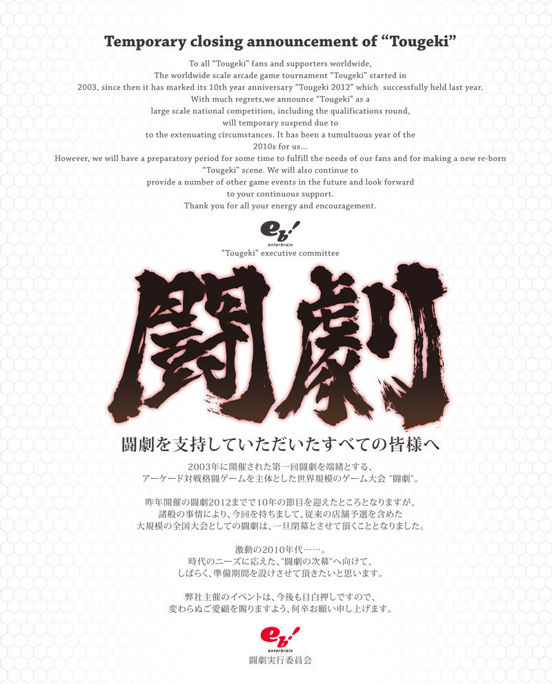 根據 enterbrain 官方表示,繼去年舉辦的 2012 年鬥劇,活動已迎接了 10 週年的到來。不過 2013 年因為各方因素,從今年起包含店家預選到全國大賽的大規模鬥劇活動,從今年起暫時閉幕。官方也表示為了因應變化劇烈的 2010 年代,今後將會順應遊戲玩家的需求,朝著「鬥劇的下一幕」來設下準備的時間。