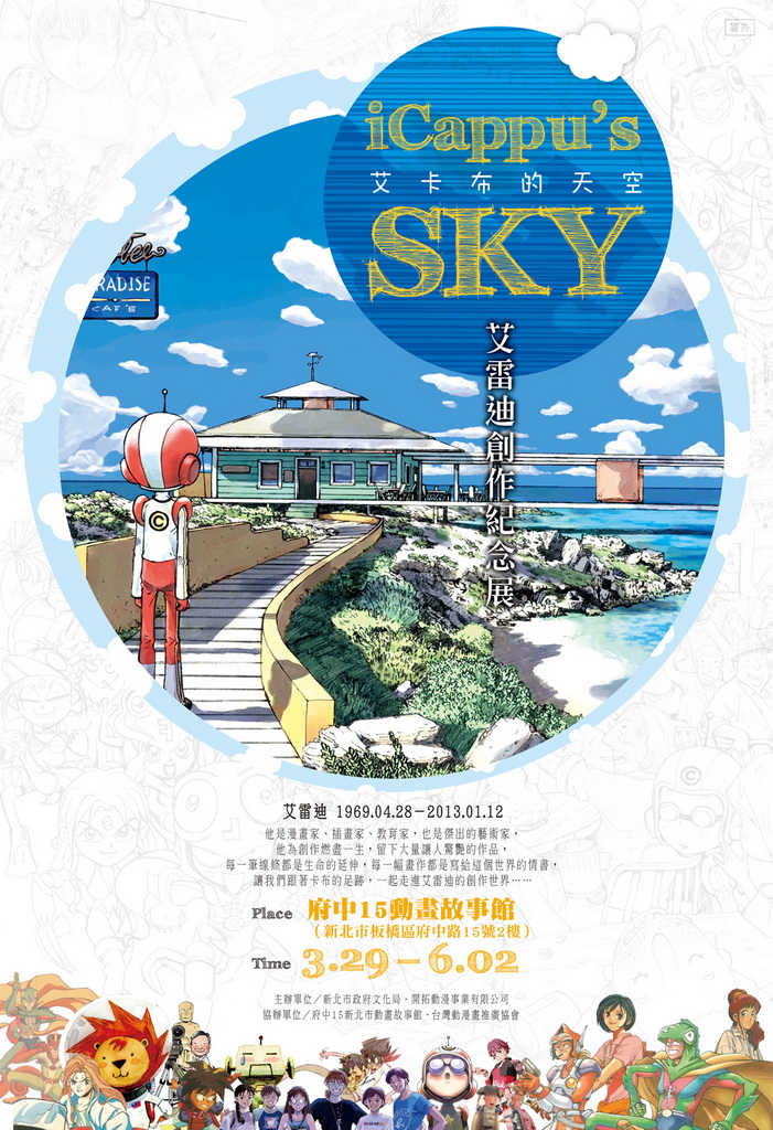新北市府中15動畫故事館自開設以來,便廣受民眾歡迎,精彩的的動漫畫展覽豐富了人們的心靈、也開拓了大家的視野。而即將於三月底登場的,是為了紀念台灣資深漫畫創作者艾雷迪老師所舉辦的「iCappu's Sky—艾雷迪創作紀念展」。