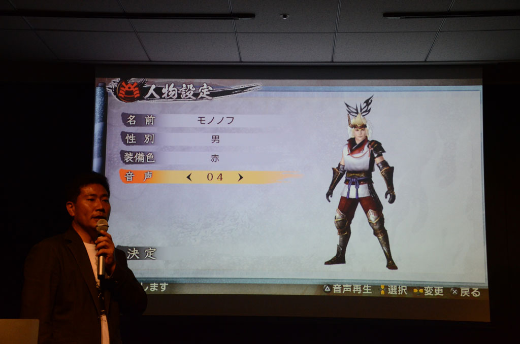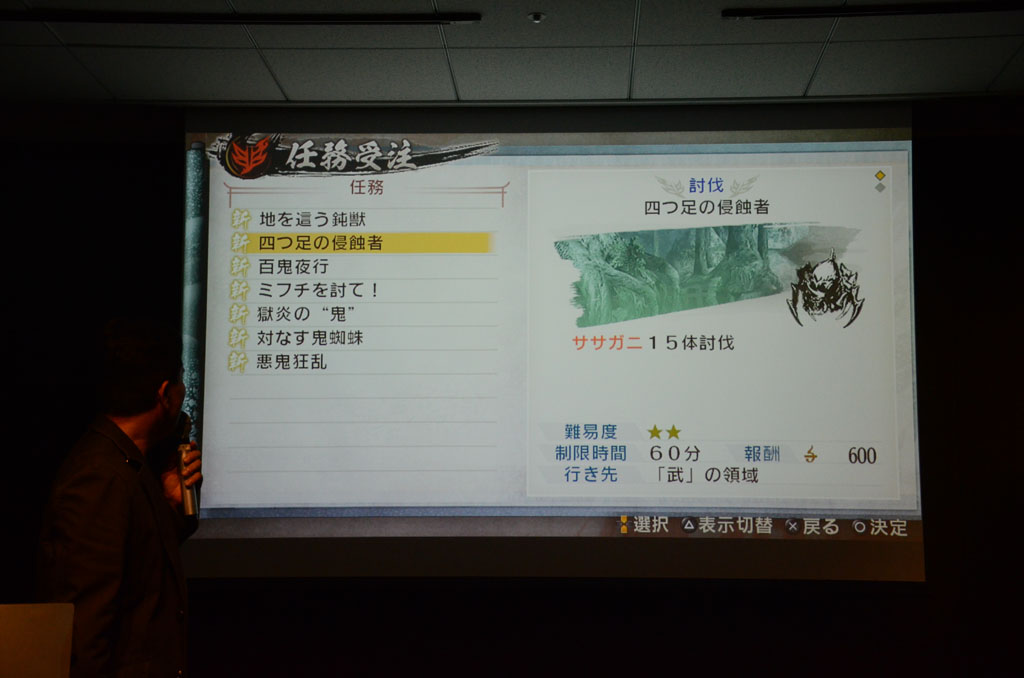 接著上台的本作製作人小笠原賢一先生訴說了本作的魅力。雖然本作使用了「武士們啊,討伐惡鬼吧」這句很直接的宣傳台詞,但小笠原先生表示「本作完完全全是一款狩獵動作遊戲作品。與巨大鬼戰鬥的緊迫感,將鬼逼入絕境的興奮感,打倒敵人的達成感,以這些充實的要素為概念來製作的」。