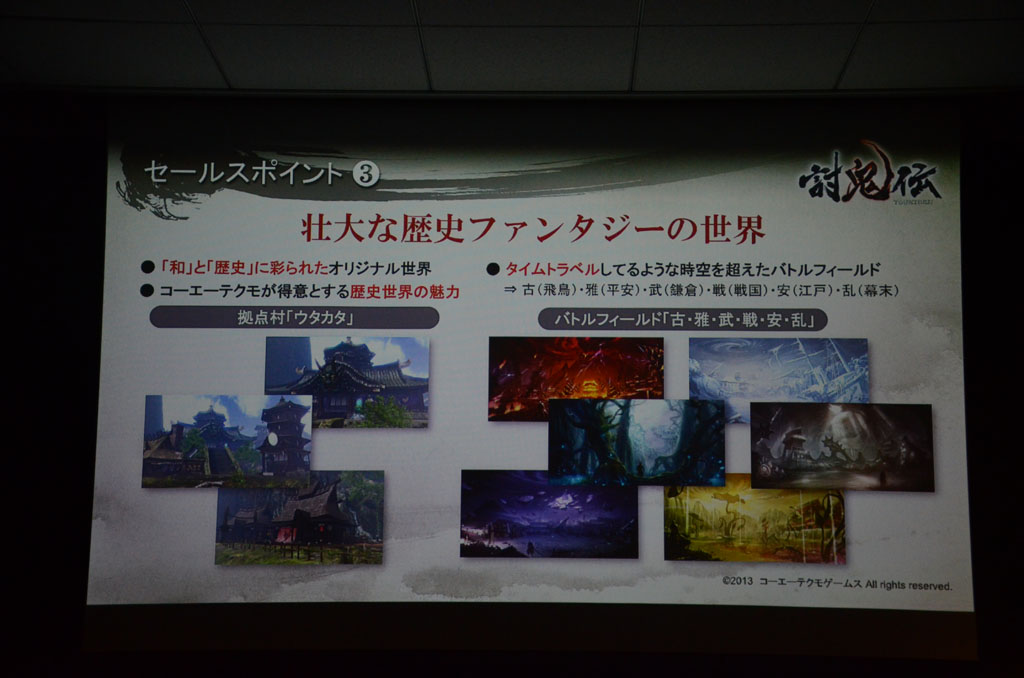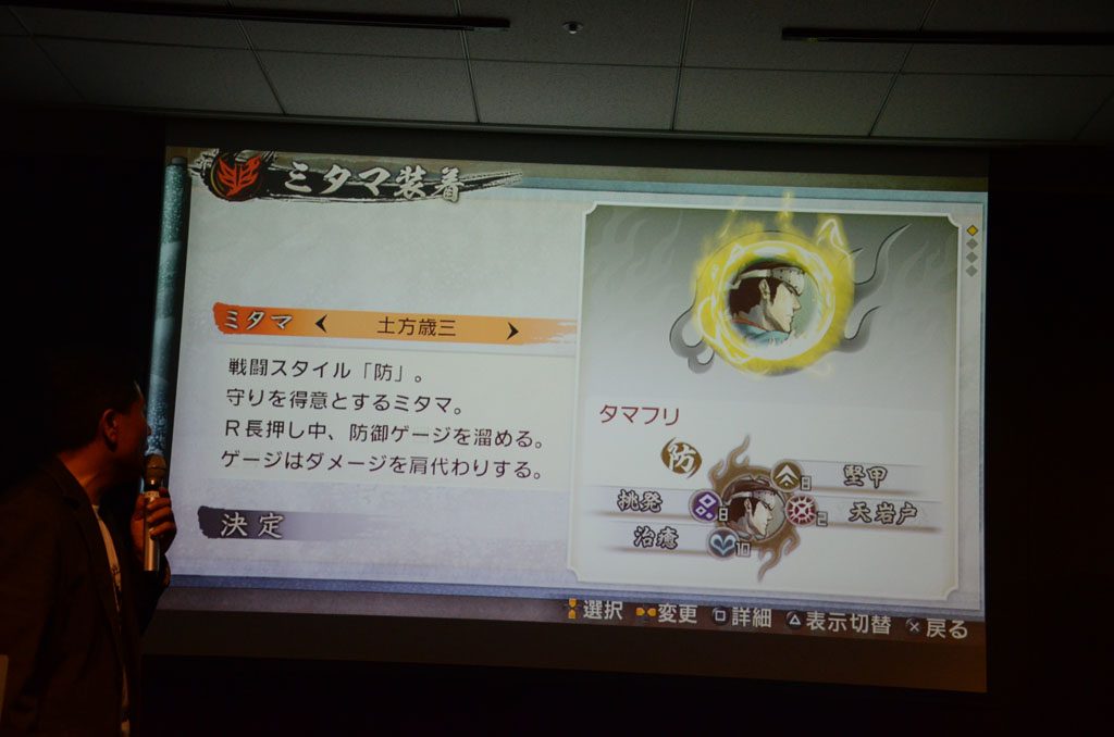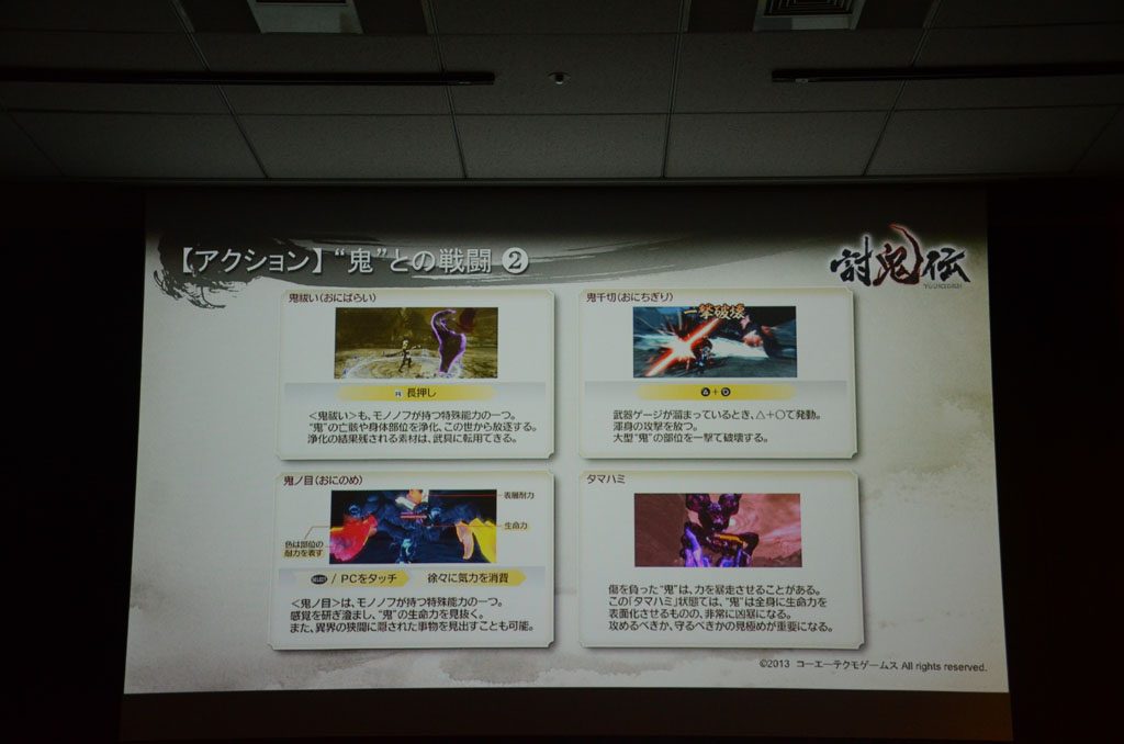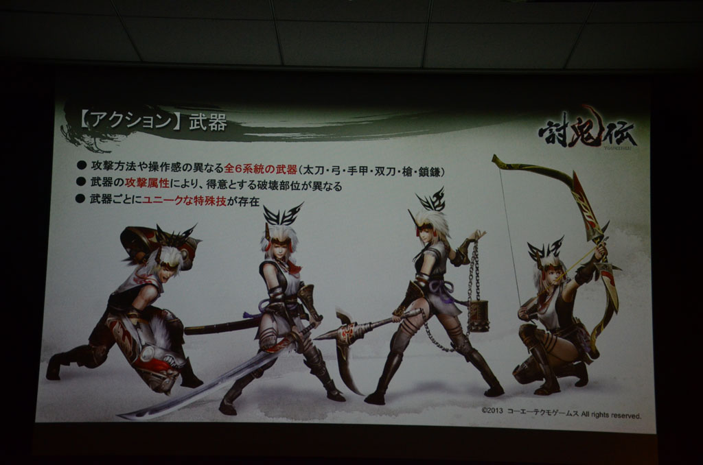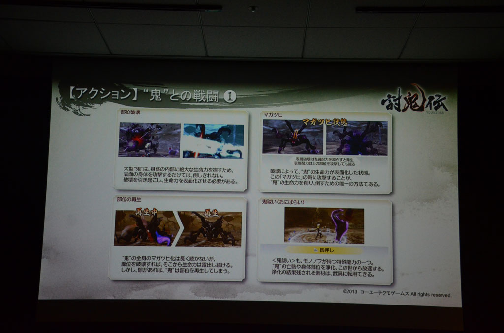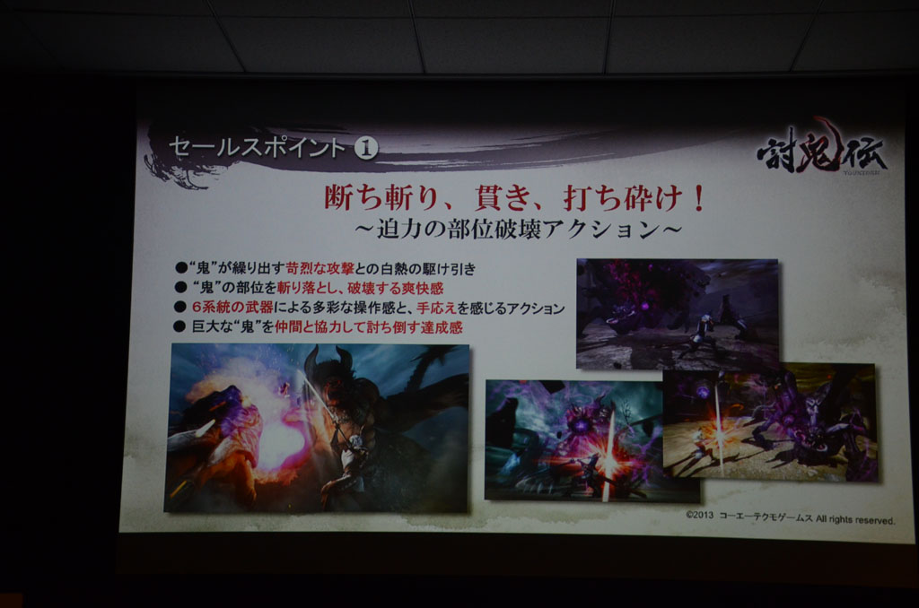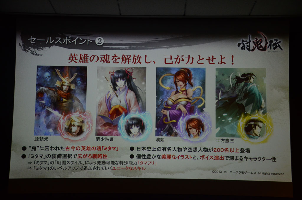 而有關本作賣點,小笠原先生舉出:玩家以自已的動作來破壞鬼身體部位時的爽快感。六個系統的武器(太刀・弓・手甲・雙刀・槍・鎖鎌)所帶來不同的操作感,角色的成長要素「御魂」,融合和風與 TECMO KOEI Games 所擅長的歷史要素而產生的世界觀。關於御魂的補充說明,這是一個解放英雄的靈魂來成為玩家力量的系統。目前公開的類型有「攻」「防」「癒」「隱」這四種,每個都有不同的 “振魂(タマフリ)”(技能),持續成長的話還會增加可使用的技能。