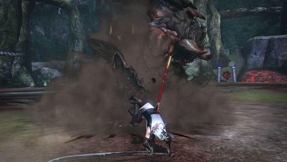 既然決定好要使用什麼武器了,那就準備挑戰任務吧。對手是蜘蛛型的鬼・深淵(ミフチ)。牠嘴吐出來的絲可封住玩家角色行動一段時間,或是用銳利的前腳來斬向玩家,可說是不能大意的對手。戰鬥開始時,馬上使用了鬼之眼得知深淵的腳可以破壞,所以運用緊急迴避動作來靠近,使用太刀持續攻擊。再用振魂來強化攻擊力之後,順利的破壞部位了,雖然只差一步就可以殺掉對手,不過因為要進行多人遊玩的關係,這場勝負就先保留了。
