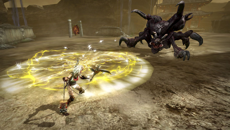 筆者這次使用攻擊範圍及速度都有不錯平衡的太刀來遊玩。基本的操作方法為,左類比搖桿是移動,□ 鈕跟 △ 鈕是一般攻擊,× 鈕是衝刺,× 鈕跟左類比搖桿一起操作的話就是緊急迴避動作,○ 鈕是發動每把武器的特殊技能。平常就有在玩動作遊戲的玩家一定可以馬上順利的習慣操作。