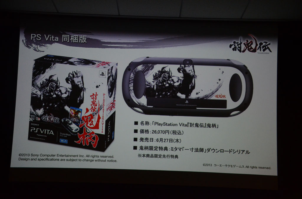 在本次的活動中除了宣布《討鬼傳》的發售日為 6 月 27 日之外,也發表了將限量推出同梱遊戲軟體與原創圖案設計的 PS Vita 主機(Wi-Fi)「PlayStation Vita 討鬼傳 鬼柄」,PS Vita 版的體驗版也發表了會在 4 月 2 日釋出。本篇報導將為各位送上由《討鬼傳》開發小組所進行的第一部「展示」,以及可實際試玩的第二部「討伐」的現場狀況。