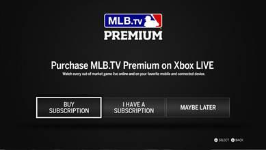 從 Xbox 360 上購買:直接從應用程式中購買你的 MLB.TV 超值會員,可以透過信用卡或是 PayPal 帳號來進行選購。