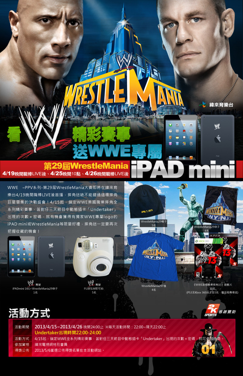 2K Sports 宣布與緯來育樂台合作,贊助第 29 屆 WrestleMania 。在 4 / 15 日到 4 / 26 日活動期間,鎖定緯來育樂台 WWE 全系列賽事,答對任三天節目中動態插卡「Undertaker」出現的次數與密碼,就有機會抽中《WWE 激爆職業摔角 13》遊戲片。