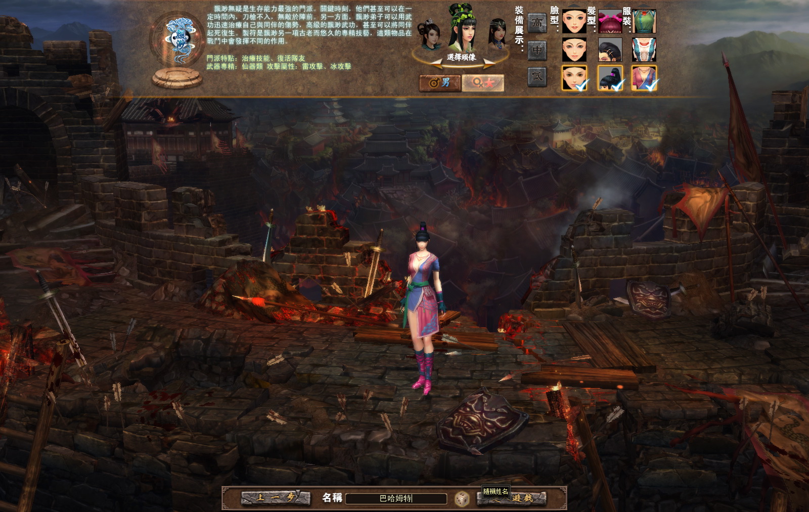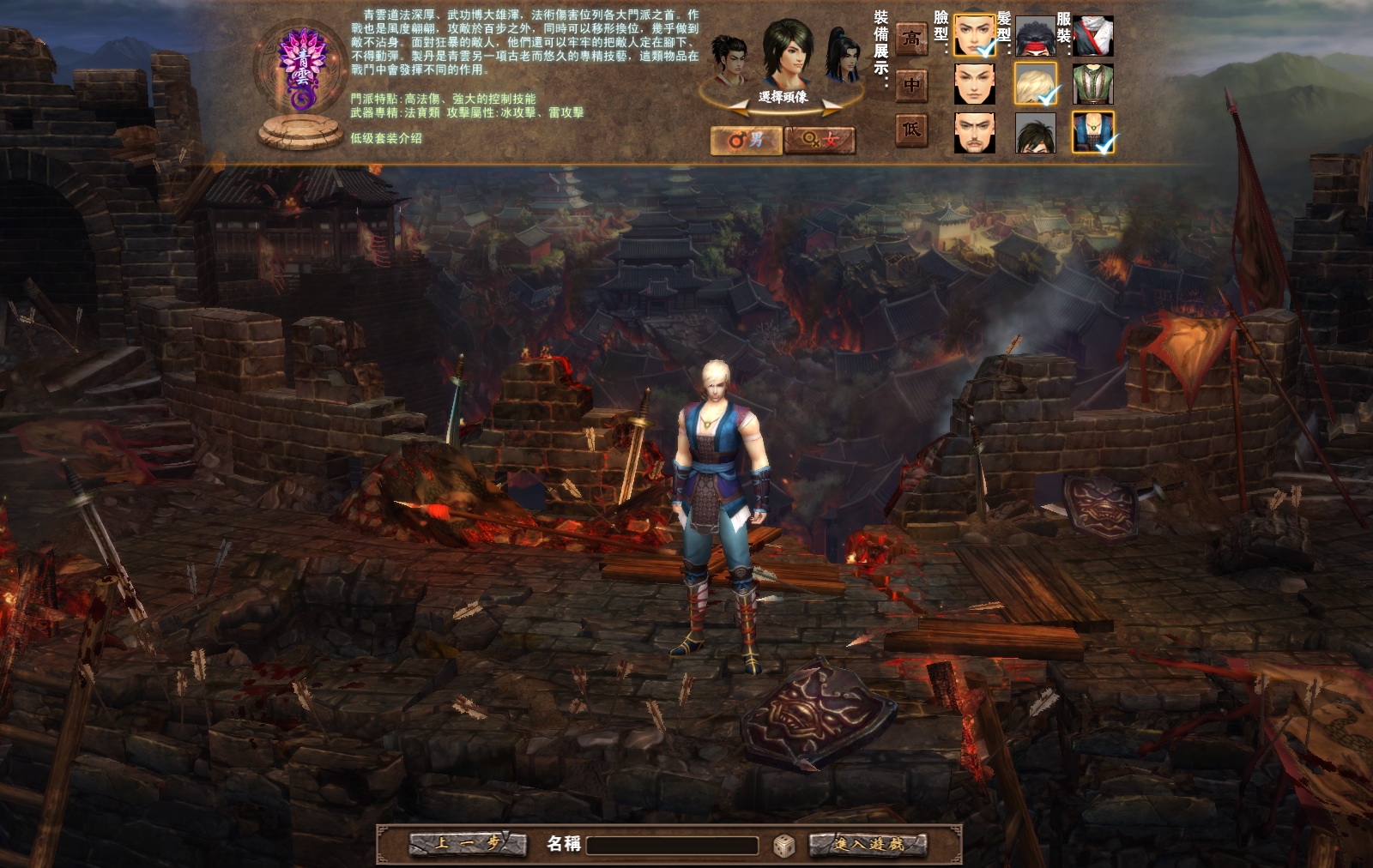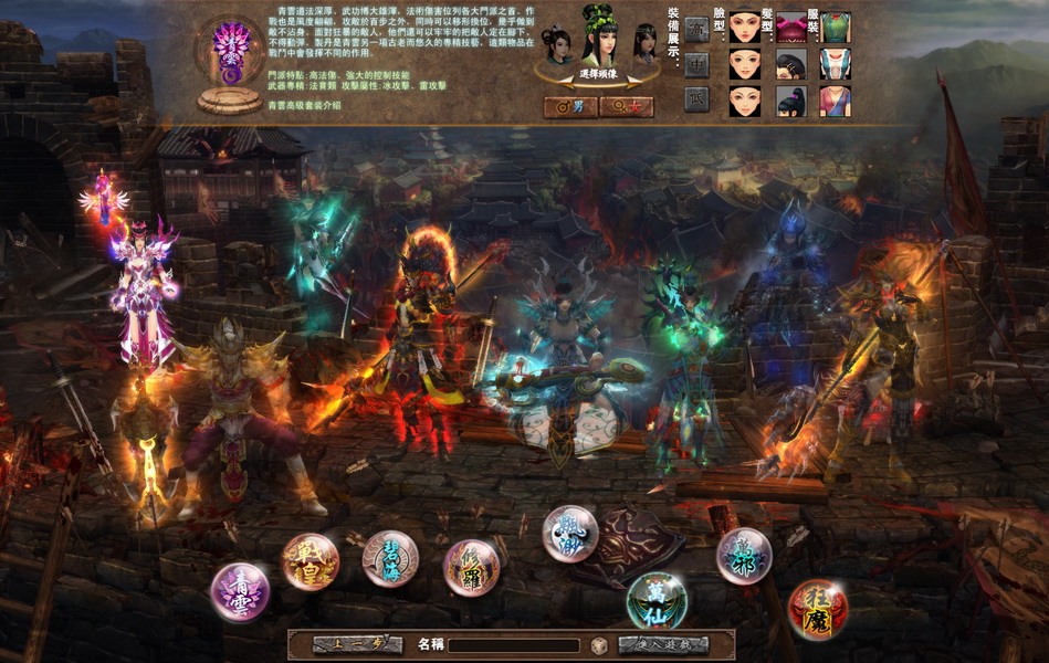 每個門派皆有男、女性別供玩家選擇,角色頭像、臉型、髮型以及服裝也有數個選項讓玩家可以選擇喜愛的造型。此外,玩家還可以透過上方提供的「裝備展示」搶先觀看該門派的裝備風格。