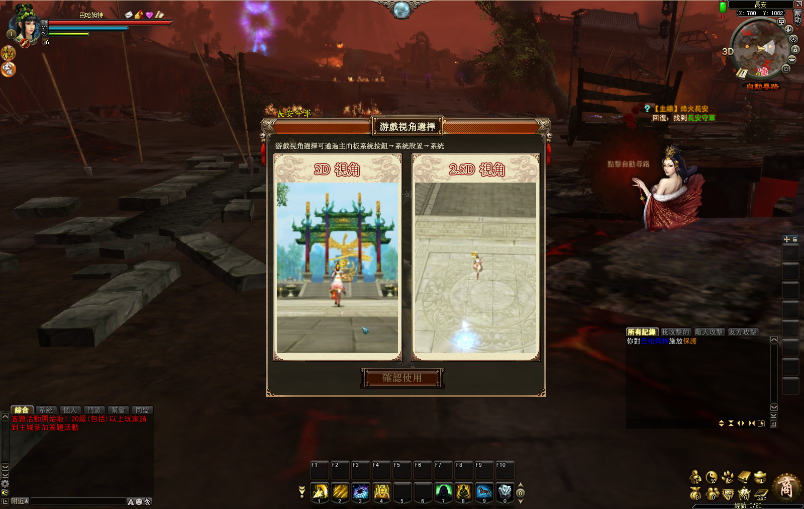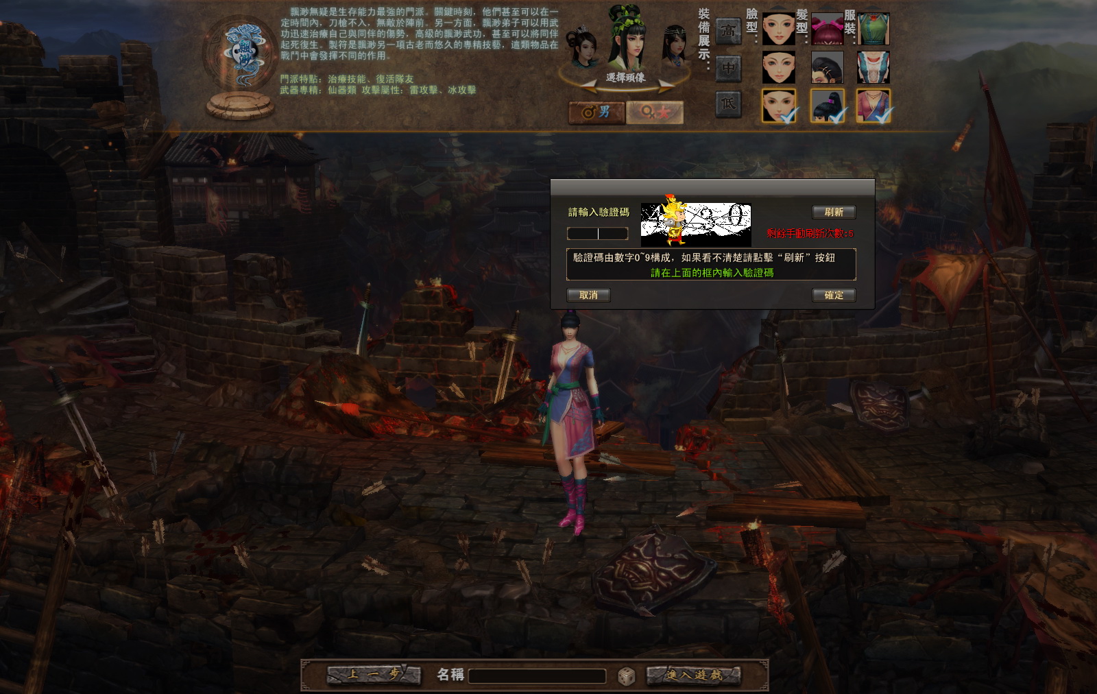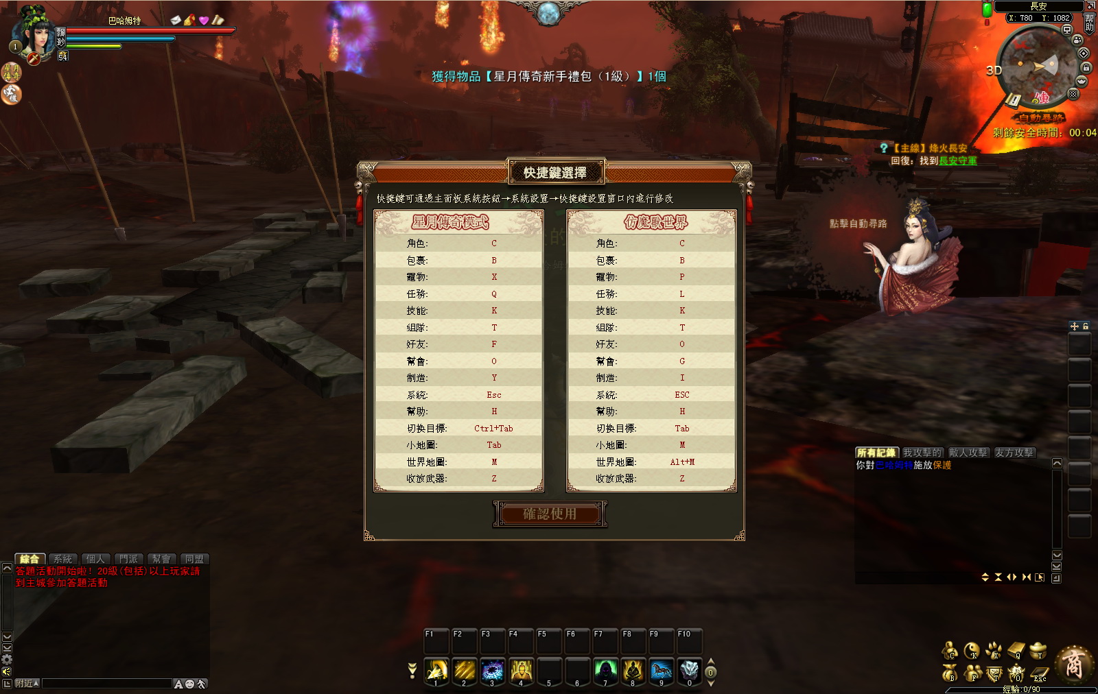 角色創建完之後,系統跳出「驗證碼」視窗,此機制是為了防止外掛自動登入。進入遊戲後,系統會跳出「快捷鍵選單」,提供兩項列表讓玩家自行選擇習慣的快捷鍵;接著,則是「遊戲視角選擇」。