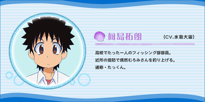 向島拓朗(CV:水島大宙),本作另一名主角,喜歡釣魚的高中生。