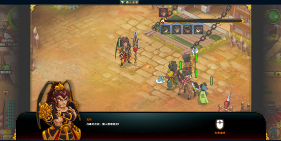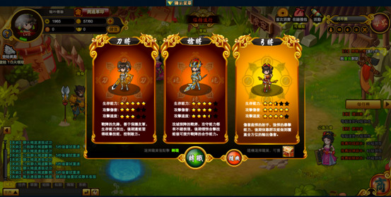 當角色達到 4 級後就可以開始選擇職業,刀將是戰陣的先鋒,生存力能很強,善於保護隊友,後期還有暈眩技能,並且武將武將擁有縱排攻擊技能;弓将是攻城掠陣的戰將,攻守能力都不錯,武將擁有群攻技能;而槍將則是傷害彪悍的射手,強悍的暴擊能力,攻擊力很突出,但是生存能力很弱,武將擁有橫排攻擊技能。筆者毫不猶豫的選擇了可愛俏皮的弓將。