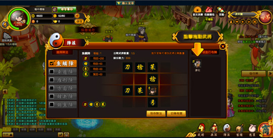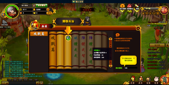 遊戲進行一段時間後,玩家就可以開始學習兵法了。學習兵法需消耗謀略,但每次通關新的副本,都可獲得相應謀略值。一列兵法全部學習完成後才可開啟下一列兵法。兵法開啟越多,可使用的陣法也就越多。