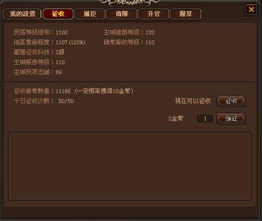 遊戲中每日可徵收12次,夏季徵收次數額外增加3次,達到15次,徵收是獲取銀幣的主要途徑之一,同時還有概率獲得金幣,是遊戲每天必做事務之一!