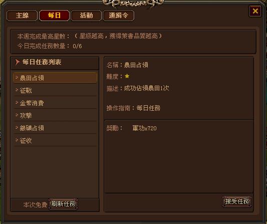 主線任務主要引導玩家熟悉遊戲,主線任務自動接受,可以同時接受多個任務,任務完成之後,需要到任務清單領取獎勵;前期完成主線任務會獲得非常豐厚的獎勵,是獲得銀幣的主要途徑!