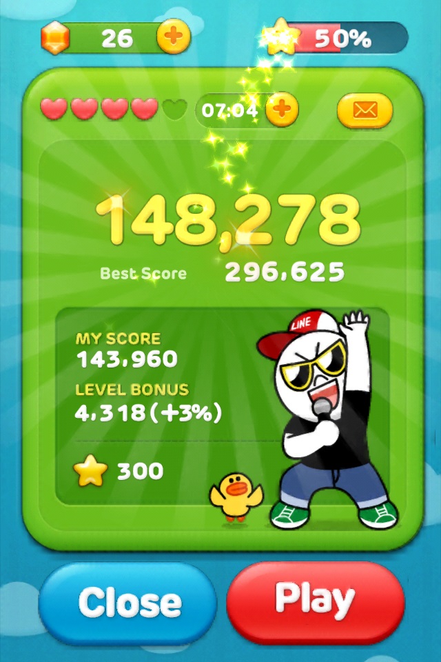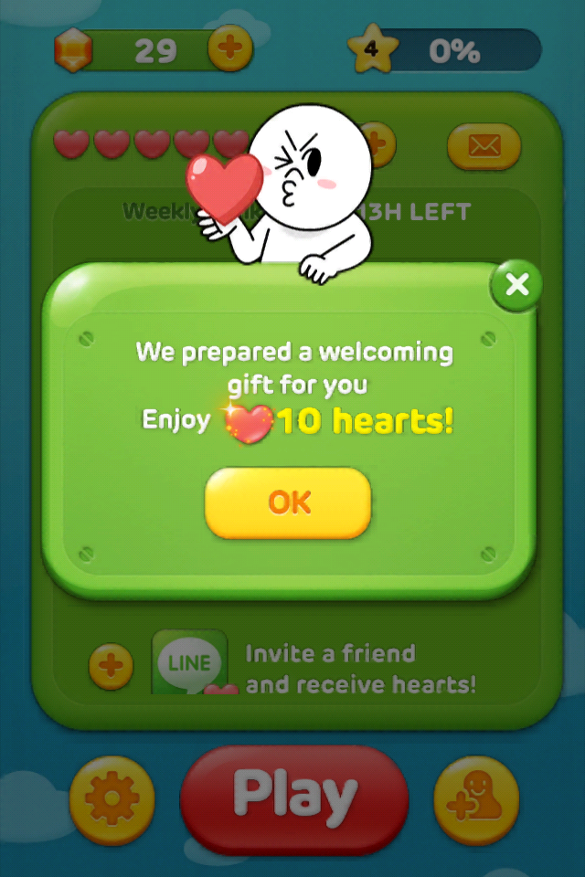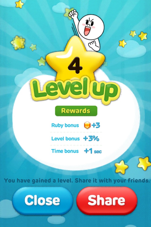 不過,遊戲雖是免費下載,但各項道具使用必須透過消耗寶石取得。寶石除了升級時額外贈送一些之外,一般必須透過付費額外購買。又如同其他同樣屬於 LINE 相關的姊妹作一樣,遊戲是採能量制,玩家必需消耗紅心才能開啟關卡。
