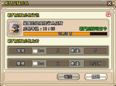 如同裝備成長系統,座騎的成長也是透過擊殺怪物來累積經驗值並提升等級。玩家可從生命值上限、魔法攻擊力等十四項成長方針中選擇兩項成長素質發展,戰鬥座騎升級時,系統將從已選擇的兩項成長方針隨機擇一進行升級強化。玩家需要特別注意,成長方針一旦選定即無法經由一般途徑進行變更。騎乘成長中的戰鬥座騎,擊殺怪物的同時,角色只會獲得 90% 經驗,系統會轉換 10% 成為戰鬥座騎成長點數。