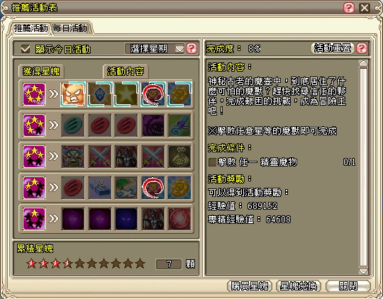 為了讓精靈使者們能夠更加快樂的享受冒險活動,我們將揮別舊版「推薦活動表」,迎接它的大改造!嶄新的「推薦活動表:星魄系統」,讓精靈使者解任務之餘,更增添新的樂趣和成就!在新的推薦活動介面中,任務將以星魄數分級,完成該層的推薦活動任務,即可獲得對應的星魄顆數。