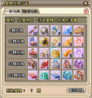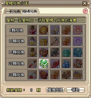 透過「星魄兌換介面」將星魄繳回,可換得各種獎勵虛寶。星魄兌換有兩種方式,「一般兌換」可花費特定數量的星魄,直接換得想要的物品。「隨機兌換」則是花費 5 顆星魄從第一層的獎勵列隨機抽一個品項,抽出該層的品項後,玩家可選擇領取,或是再花費 10 顆星魄繼續抽第二層的獎勵。以此類推,最多可抽第五層的獎勵。