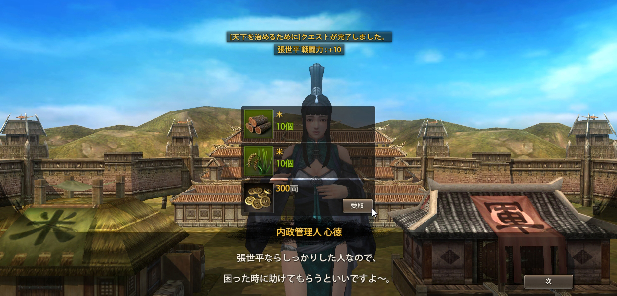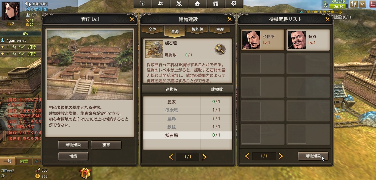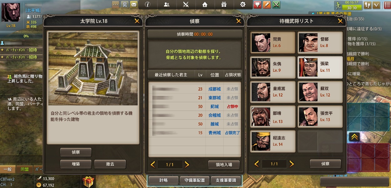 除此之外,在領地中還可以建設可以得到兵糧的「農場」,跟可採集到各種資源的「伐木場」、「鐵礦」、「採石場」,以及增加人口上限的「民家」等設施。另外,也可讓部下武將去負責工作,讓各設施的等級上升。