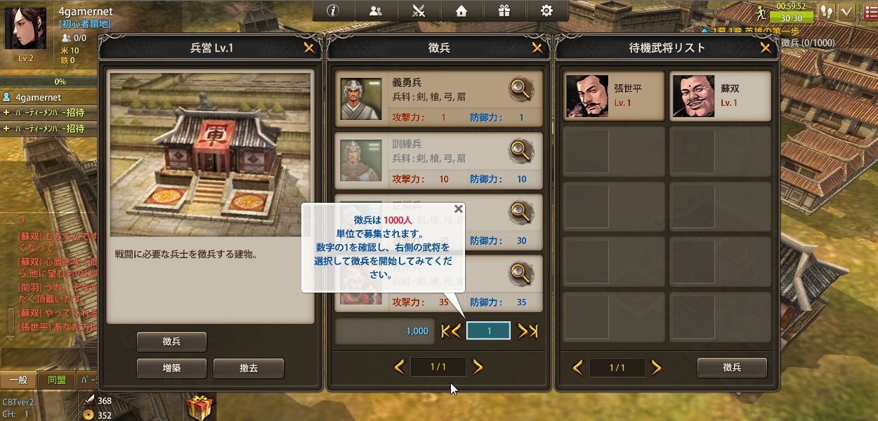 隨著遊戲進行,每個玩家都可以得到「初學者專用領地」,在這邊要建設最重要的設施 「兵營」來進行“徵兵”的動作。在本作的戰鬥中,當玩家的軍隊受到攻擊時會減少武將所率領的“士兵數”而不是“HP”,而減少的士兵會從兵舍中自動補充。
