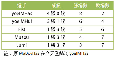 而 B 組中唯一的「完全業餘選手」Musou(隋坤佑),雖然名氣比起其他選手略顯不足,但這不影響他在挑戰賽中發揮實力,擅長的莽夫流一度讓他對 Hui 先馳得點,甚至威脅到 Has 的全勝霸業,然而他還是有著業餘選手的通病,穩定度的不足讓他以 1 勝 3 敗成績作收,沒能成為 B 組中的黑馬。