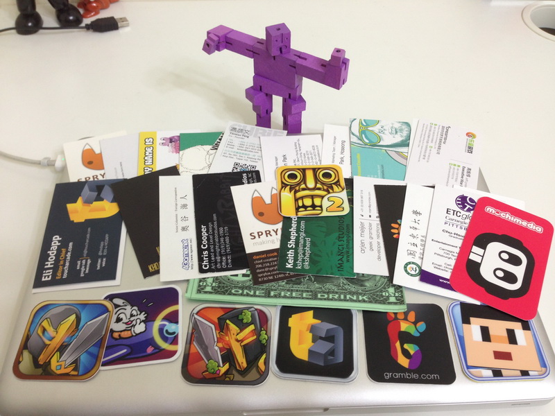 但在環境吵雜、人潮眾多的展場中,要與其他業者交換名片可說是非常困難!因此許多遊戲開發者就紛紛把自己的手機遊戲 Logo 製成貼紙,黏在自己的衣服上,這樣一來不僅一目了然,也增添了開發者之間彼此交談的契機。