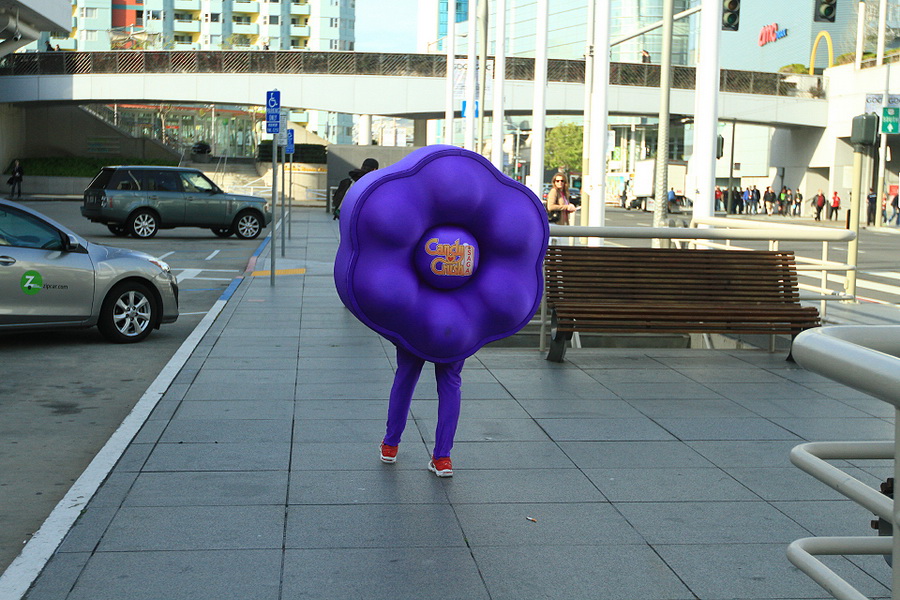 場外有知名遊戲《Candy Crush Saga》的宣傳人偶發送糖果