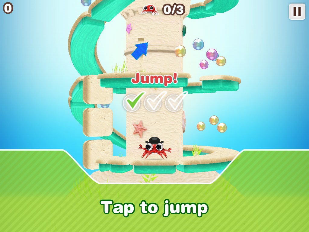操作上人物會在關卡內自動前進,玩家無法控制人物的左右移動,只有在角色走到盡頭後才能自動轉向,玩家所要作的是點擊畫面控制螃蟹先生的跳躍,讓牠能順利的閃過陷阱、障礙。