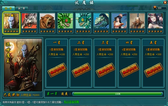 當人物達到 32 級,開啟「伏魔」。伏魔系統共分五大章節、各九個小副本。玩家可透過副本通關,取得額外的屬性提升獎勵,每通關一星,屬性再提升,直到最大的五星。此外,通關至指定星級,可以使寵物幻化為相應副本的 BOSS 形象,讓寵物外觀更為多變、炫麗。