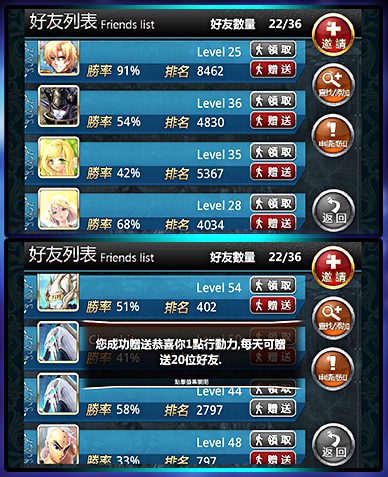 PS:值得注意的是,玩家一天內只可以贈送20位好友各1點行動力,如果好友滿50點體力值或被贈送夠20點之後,就無法給他贈送了哦。所以贈送行動力的時候記得要注意優先順序和留意對方的狀態咯!