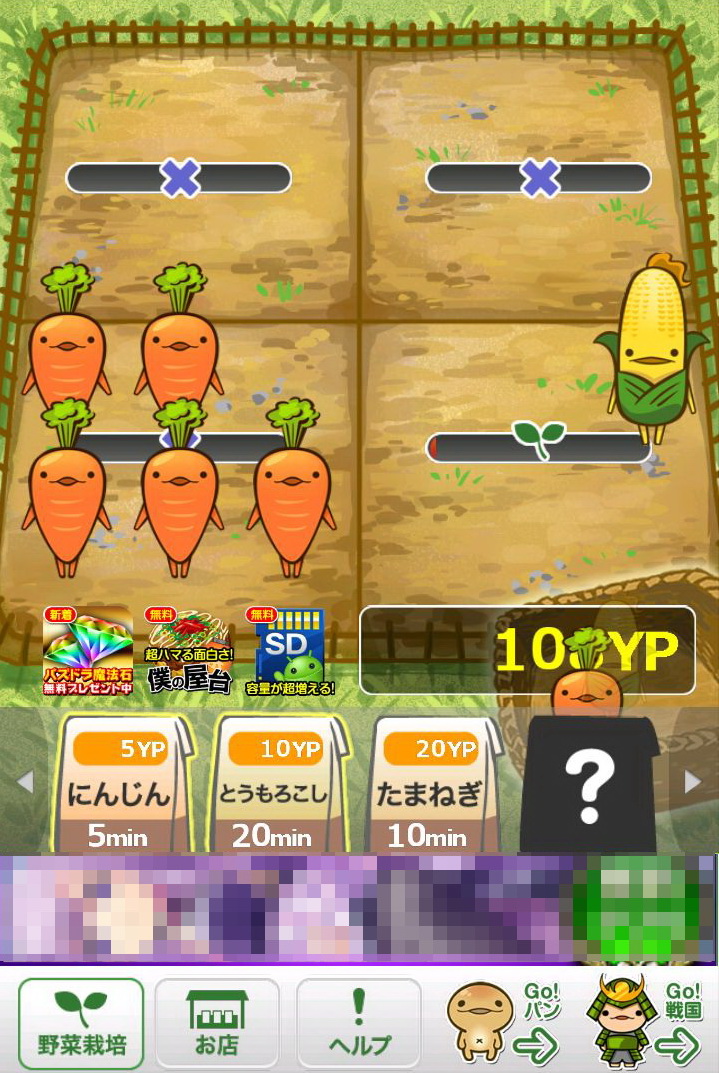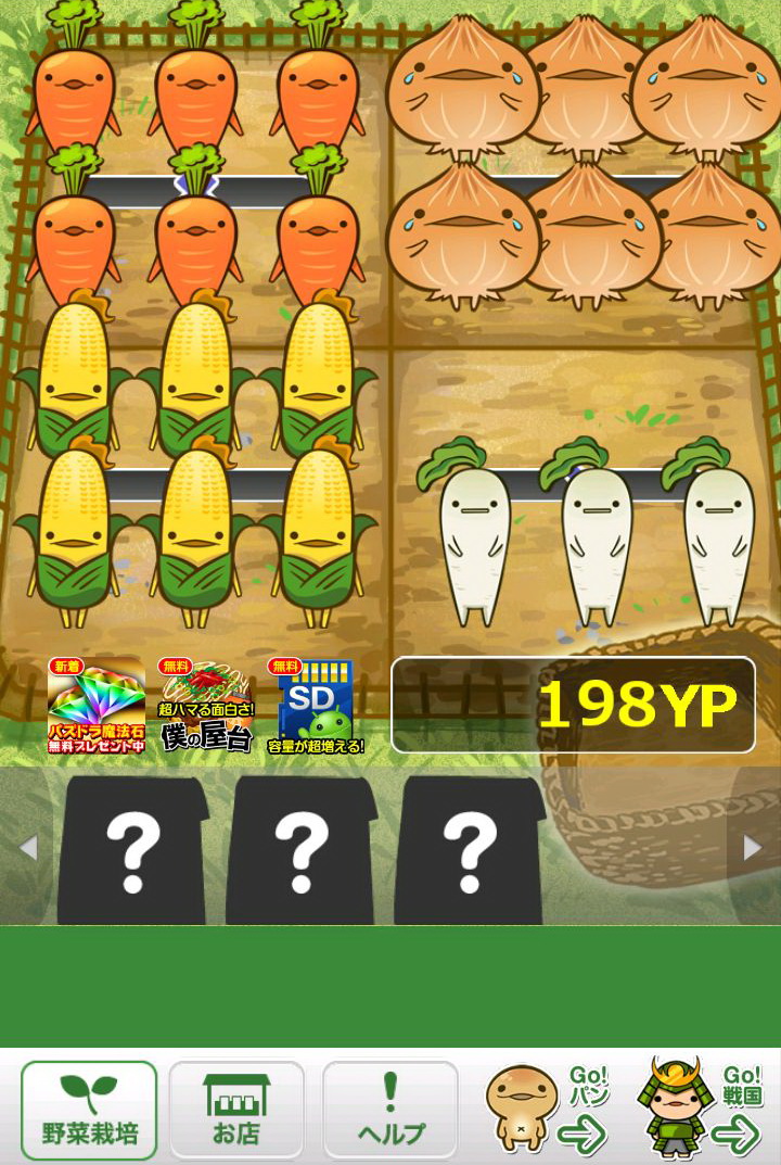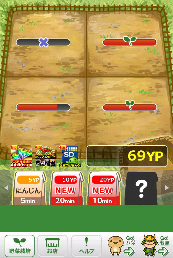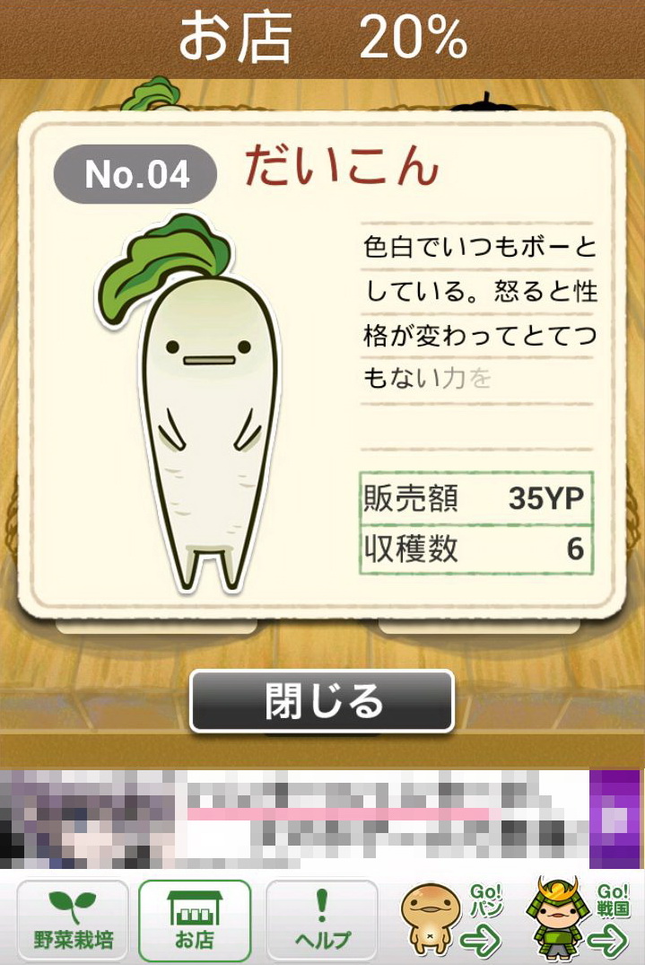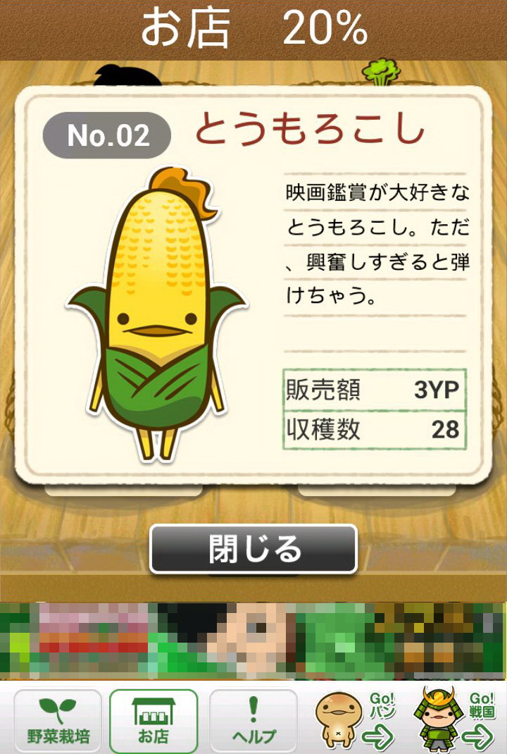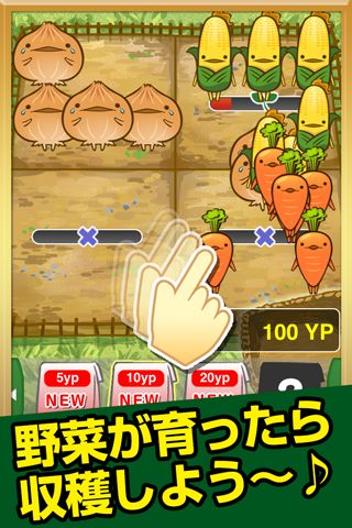 玩家所成功採收的作物,每一種都會依該種作物的價值再換算為「YP」點數,只要累積越多的「YP」,玩家就可以購買更貴的種子,同時也會解開新種的作物。只要是玩家曾經種出來的作物,都可以透過點選下方的「お店(店鋪)」選項閱覽資料。這些資料裡不但會顯示玩家曾經種植過該作物幾次、可以換成多少「YP」,更會有作物擬人化的性格說明,配上旁邊插圖呆呆的表情,看著真會讓人嘴角不自覺上揚。