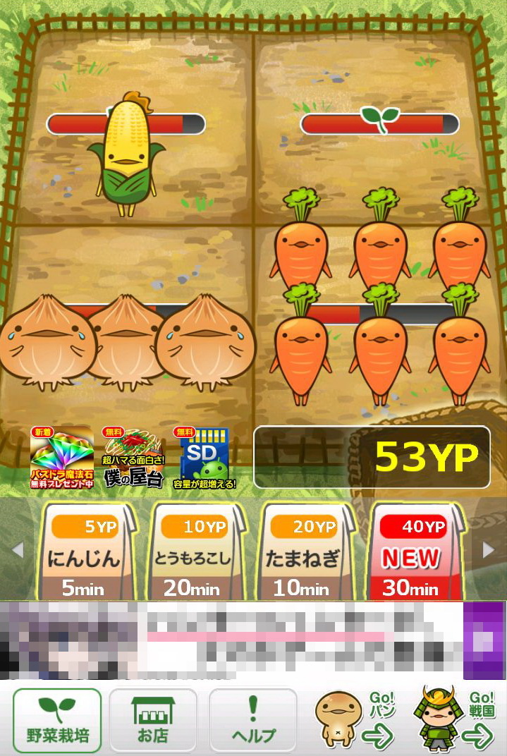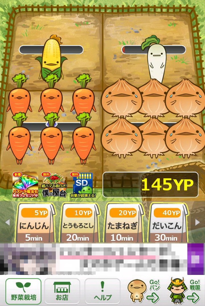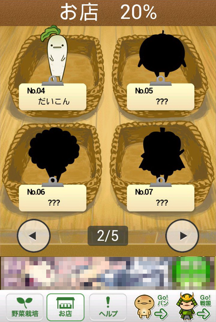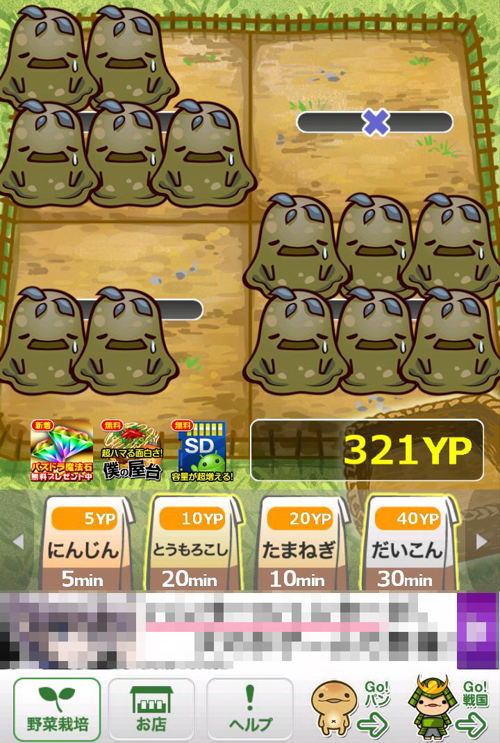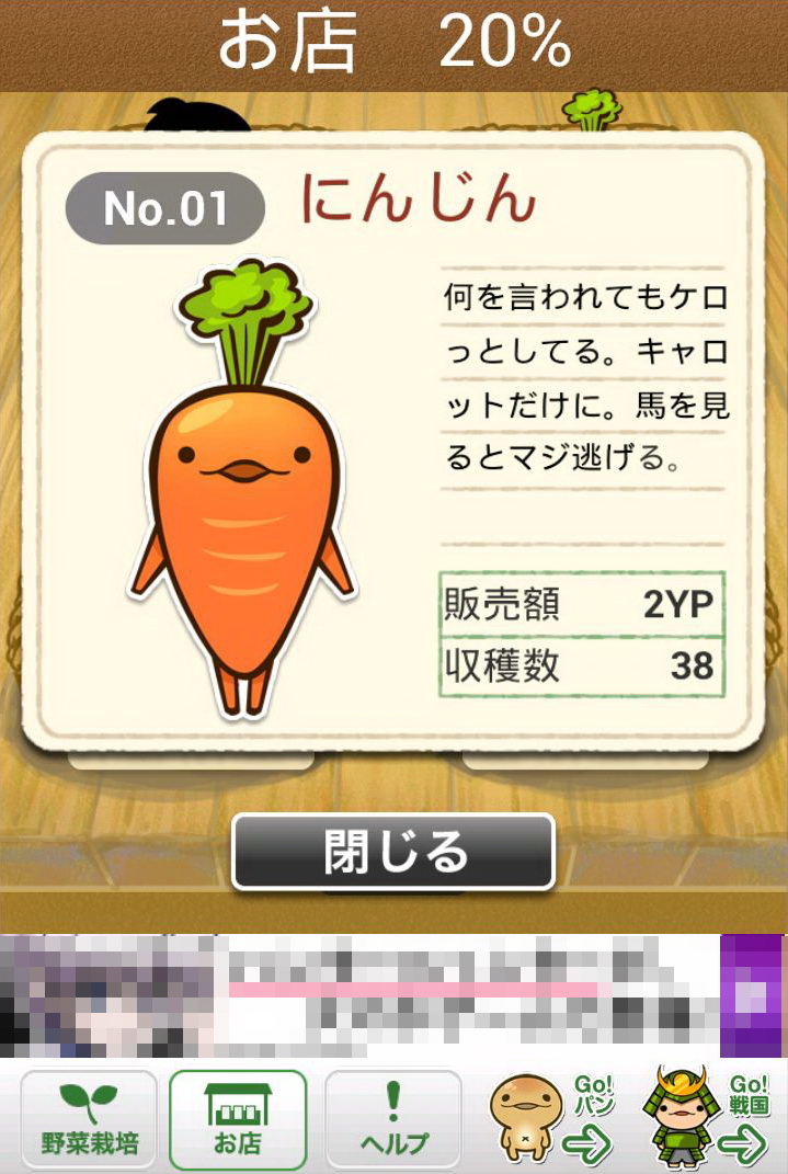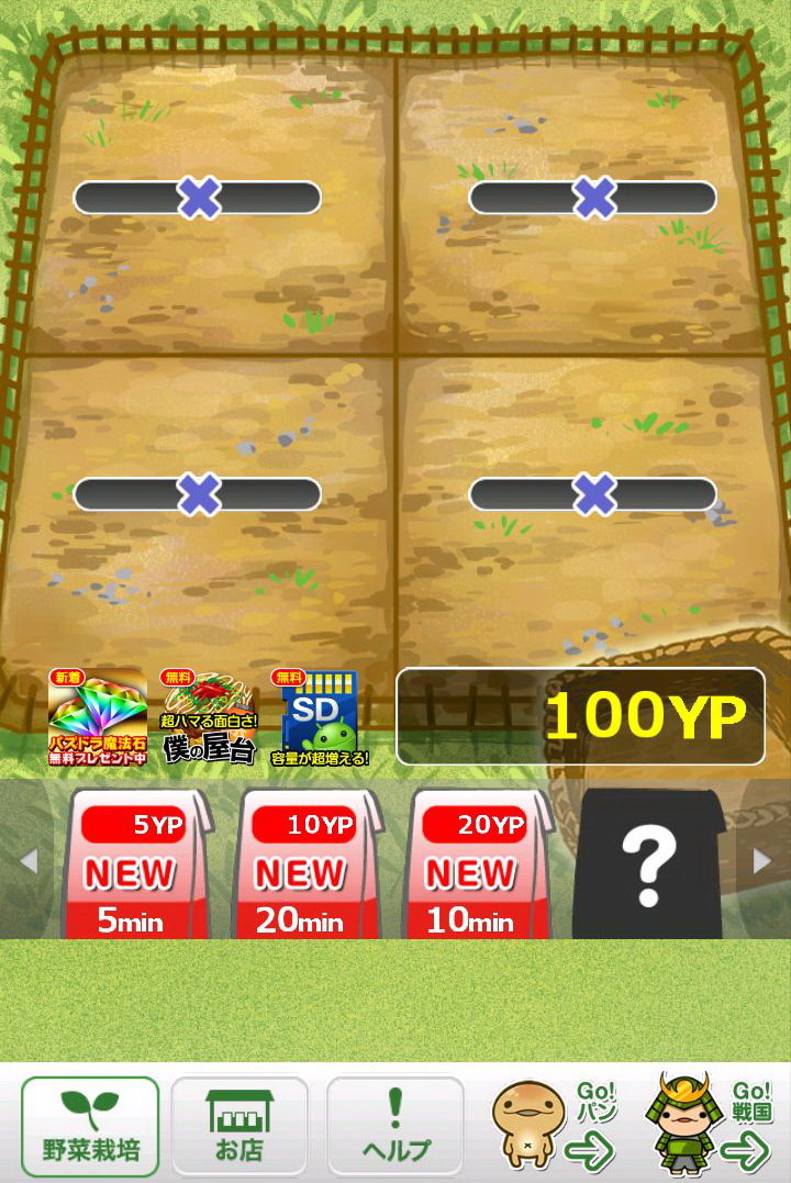 玩家所成功採收的作物,每一種都會依該種作物的價值再換算為「YP」點數,只要累積越多的「YP」,玩家就可以購買更貴的種子,同時也會解開新種的作物。只要是玩家曾經種出來的作物,都可以透過點選下方的「お店(店鋪)」選項閱覽資料。這些資料裡不但會顯示玩家曾經種植過該作物幾次、可以換成多少「YP」,更會有作物擬人化的性格說明,配上旁邊插圖呆呆的表情,看著真會讓人嘴角不自覺上揚。
