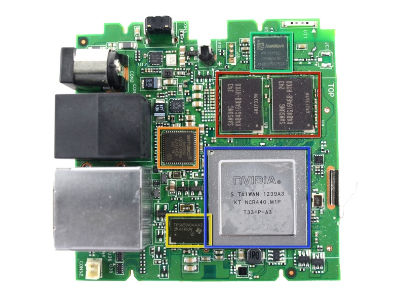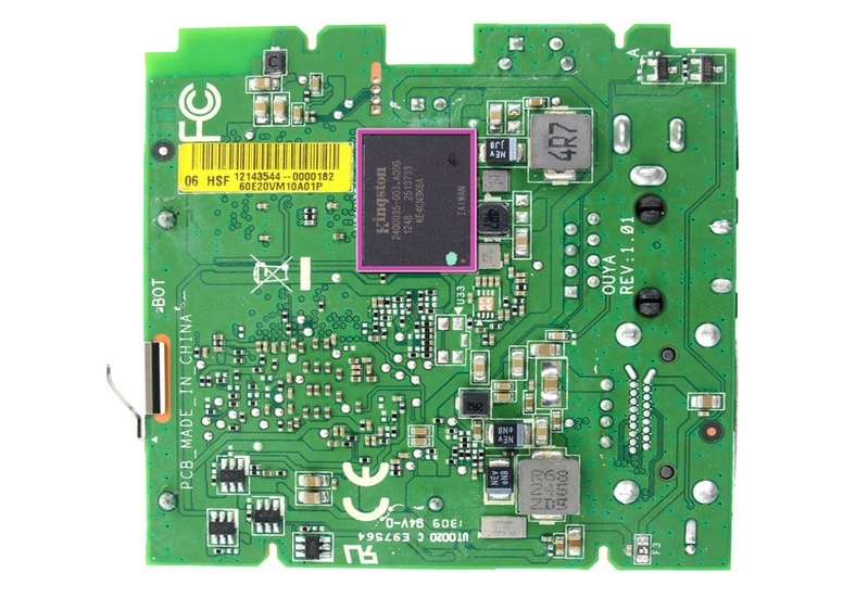 在以上這張圖片中,可以看到 iFixit 清楚地標示了 OUYA 主機版的各項晶片位置:
